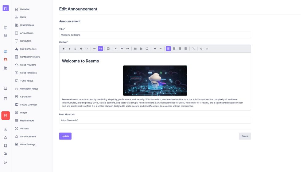 • Announcements consist of a title, rich text content, and an optional external link.
