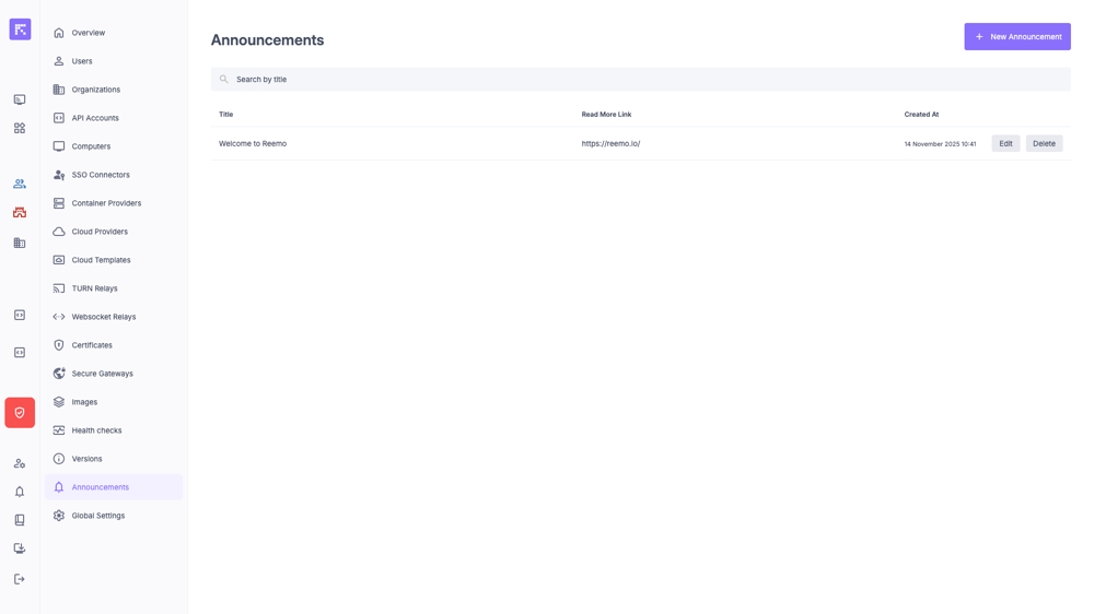 • The Announcements page centralizes the management of announcements visible to all users.