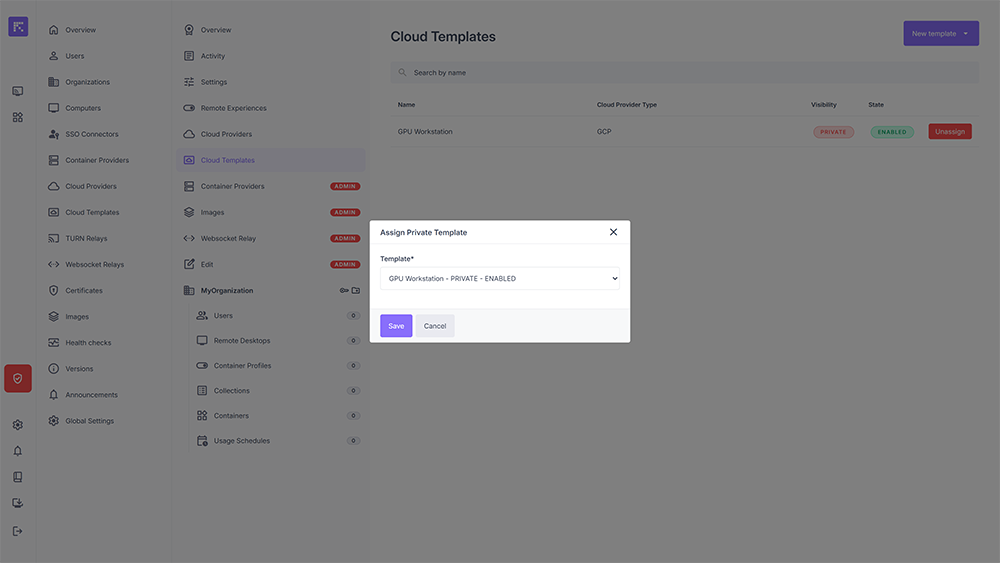 From the Cloud Templates section of an organization, it is possible to associate a private Cloud Template available on a Cloud Provider.