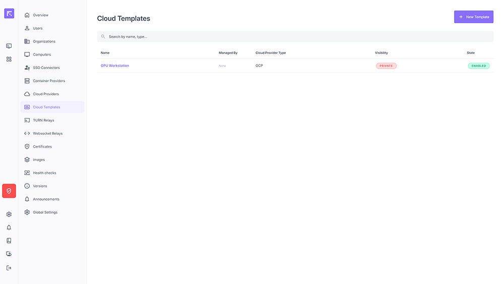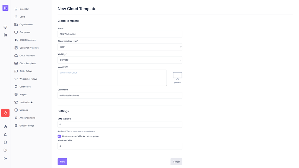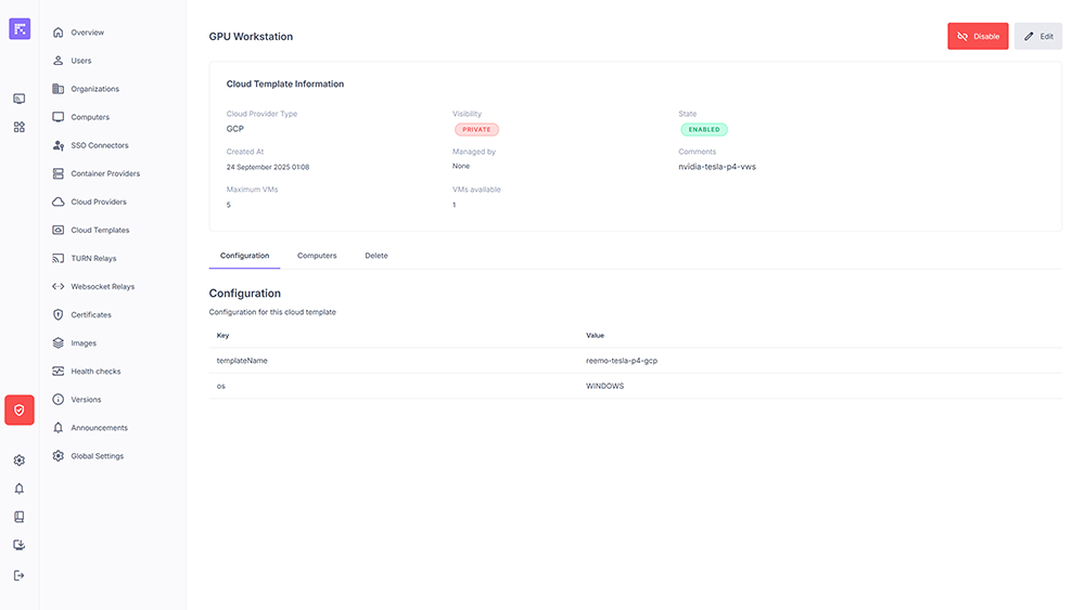 A cloud template is a preconfigured instance model created directly on a Cloud Provider (e.g. GCP). These templates define the hardware and software characteristics (OS, GPU, etc.) of a VM that will be automatically deployed via Reemo.