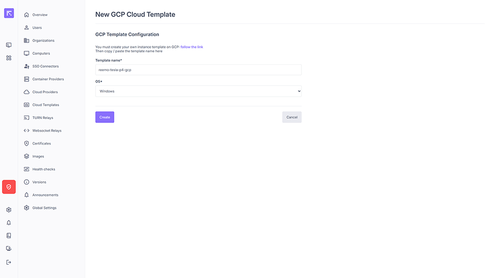 GCP template configuration in Reemo.¶