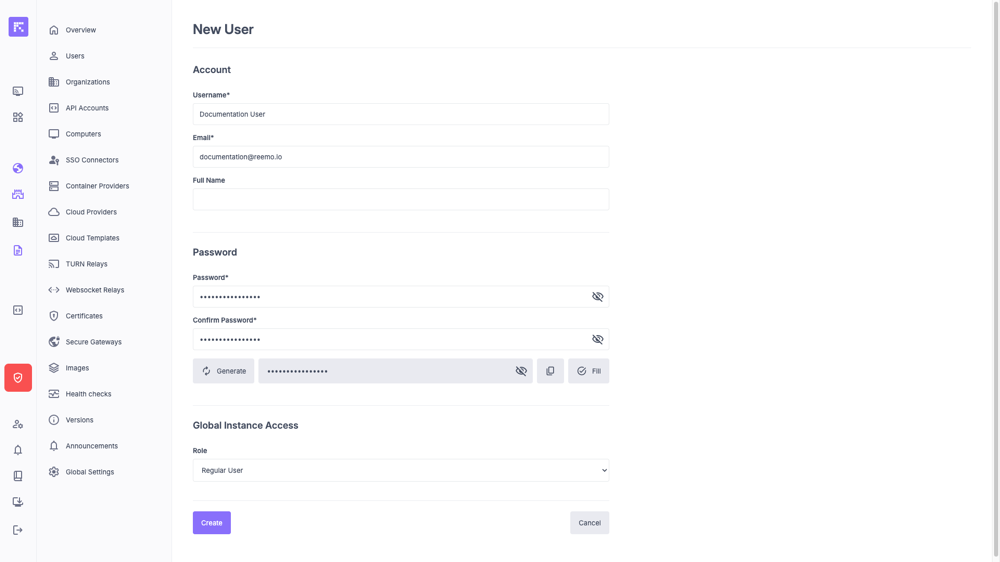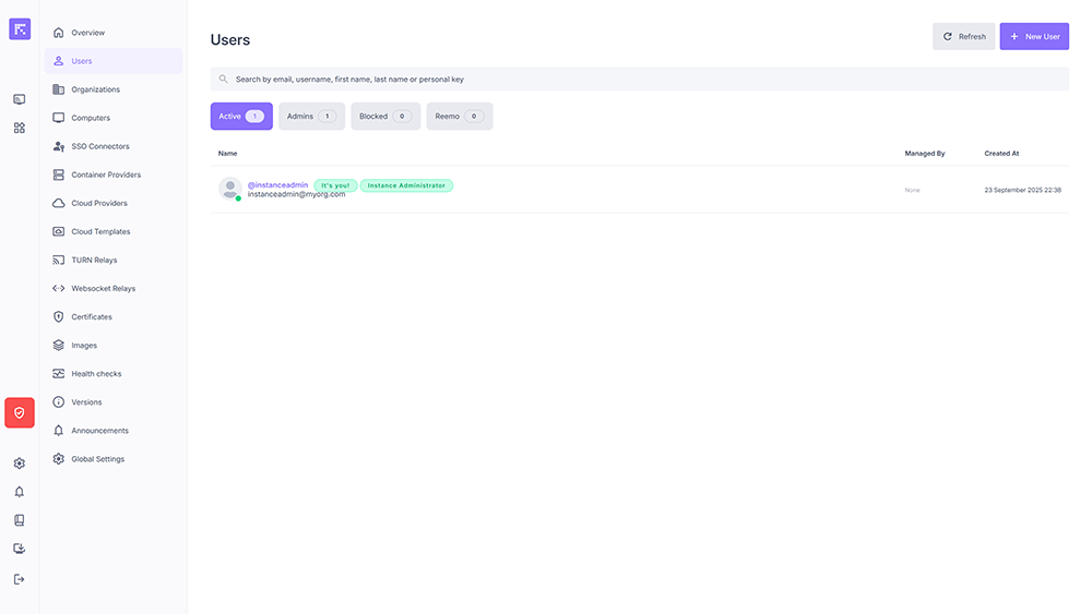 The Users section provides an overview of all users in the Reemo instance and allows you to create new instance administrators.