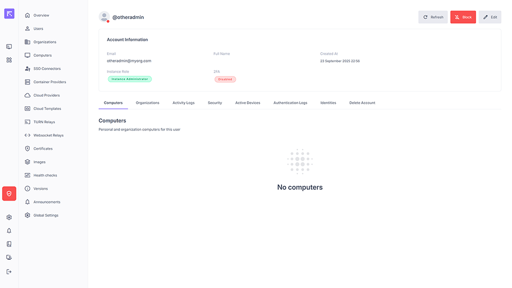 Available actions: Block, Edit, Remove 2FA, Delete account.