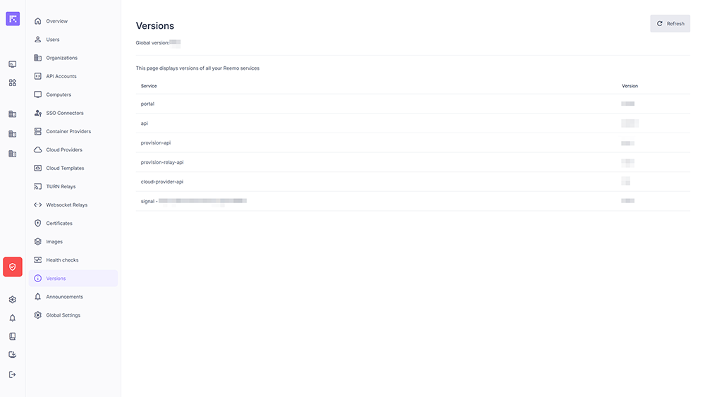 The Versions page provides an overview of the currently deployed versions of all Reemo services. It allows administrators to quickly verify version consistency across components and compare with the overall platform version.