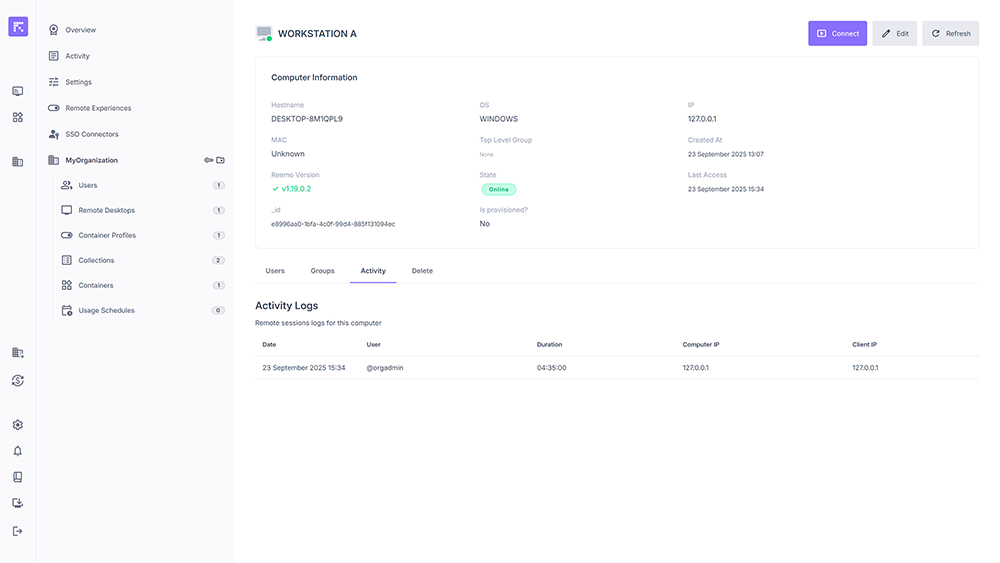 Activity logs allow you to view the history of remote connections within the organization. They can be accessed from several locations in the interface: