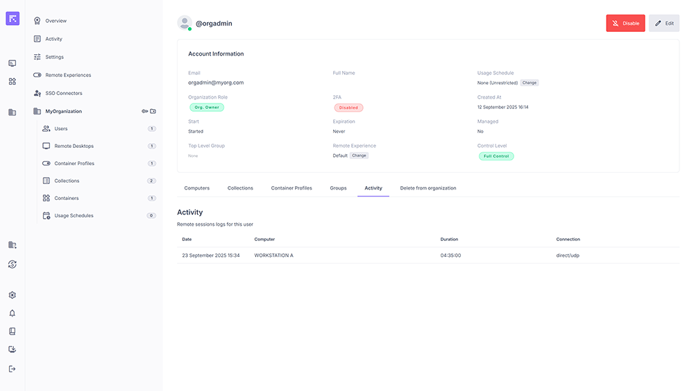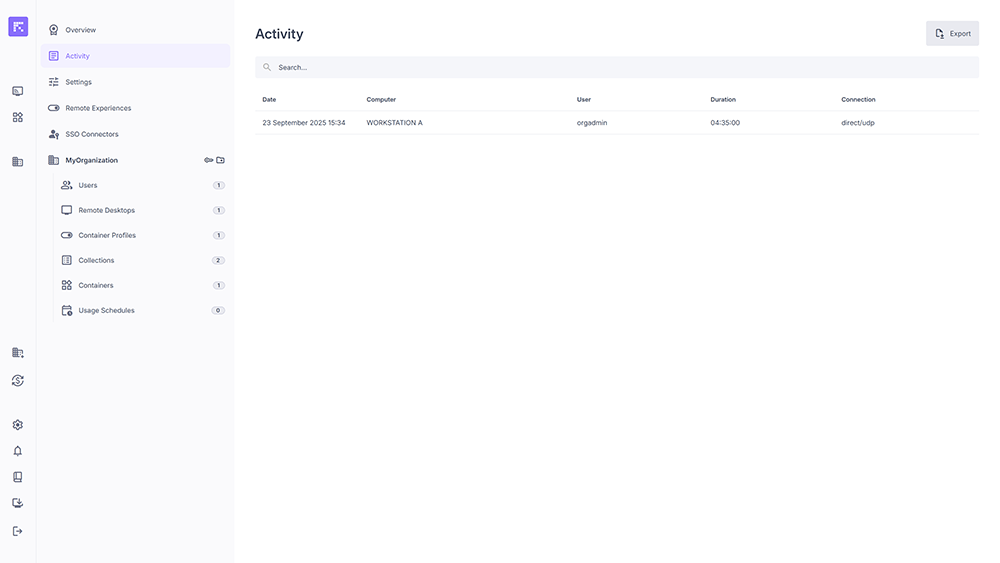 The Activity page (accessible from the sidebar) shows the history of all connections made within the organization, regardless of computer or user.