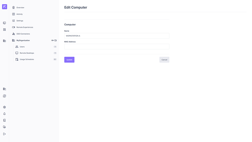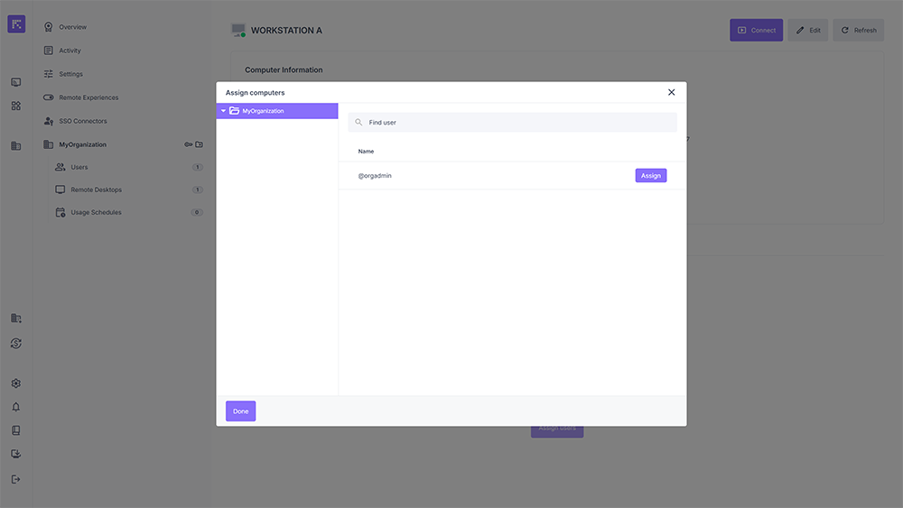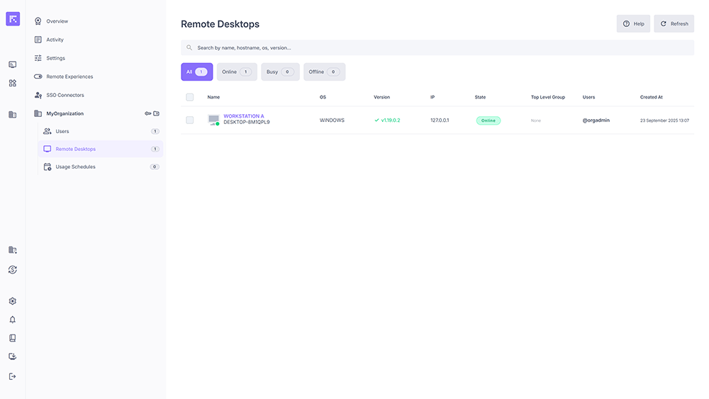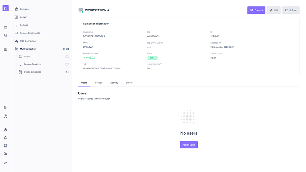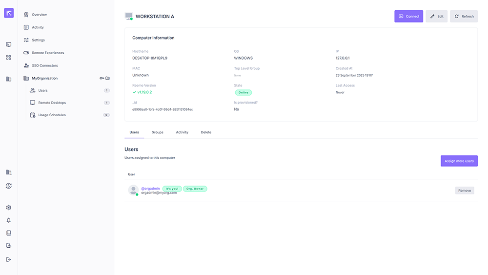 Reemo allows you to manage your remote desktops (Remote Desktops) from your organization’s management interface. You can view their information, assign them to users, and organize them according to your needs.