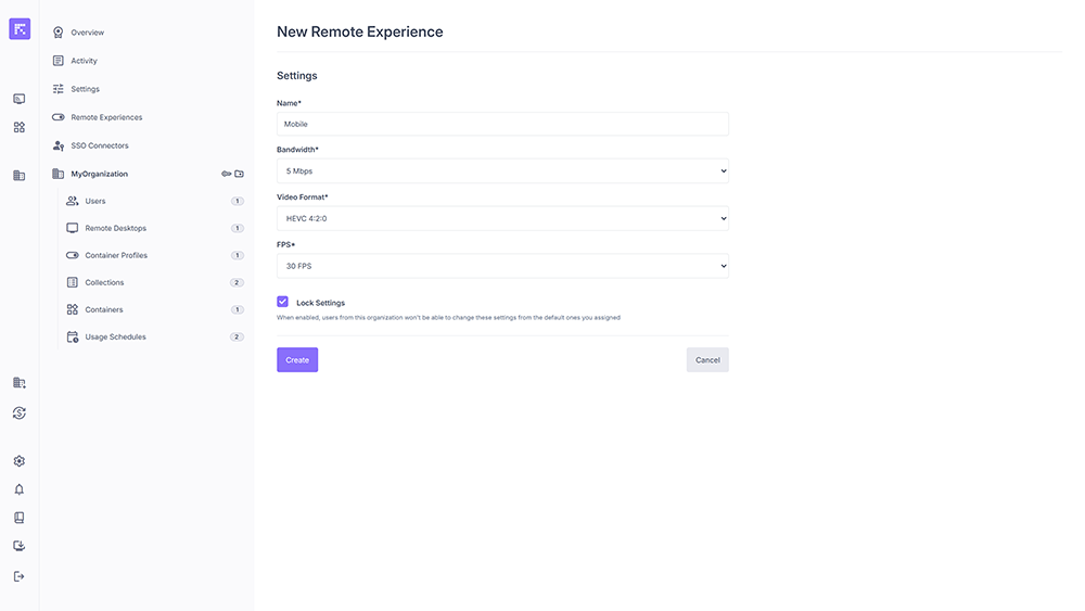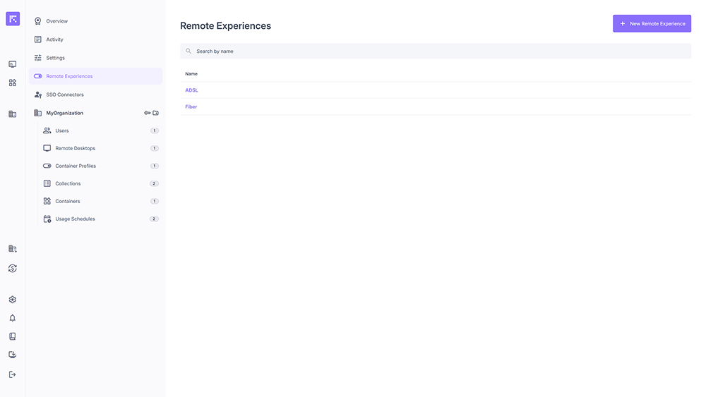 Remote Experiences allow you to customize the user experience when accessing remote computers or containers. They define connection profiles adapted to different network environments (e.g. ADSL, Fiber, Mobile) and video needs (e.g. 4:4:4 color format), by setting video quality, bandwidth, and frame rate parameters.