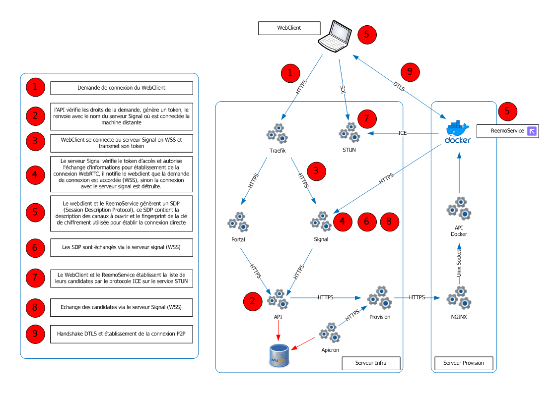 Establishing a secure WebRTC connection between a user and a container via the Reemo infrastructure.¶