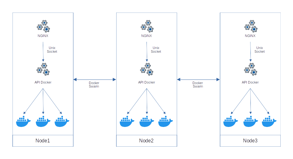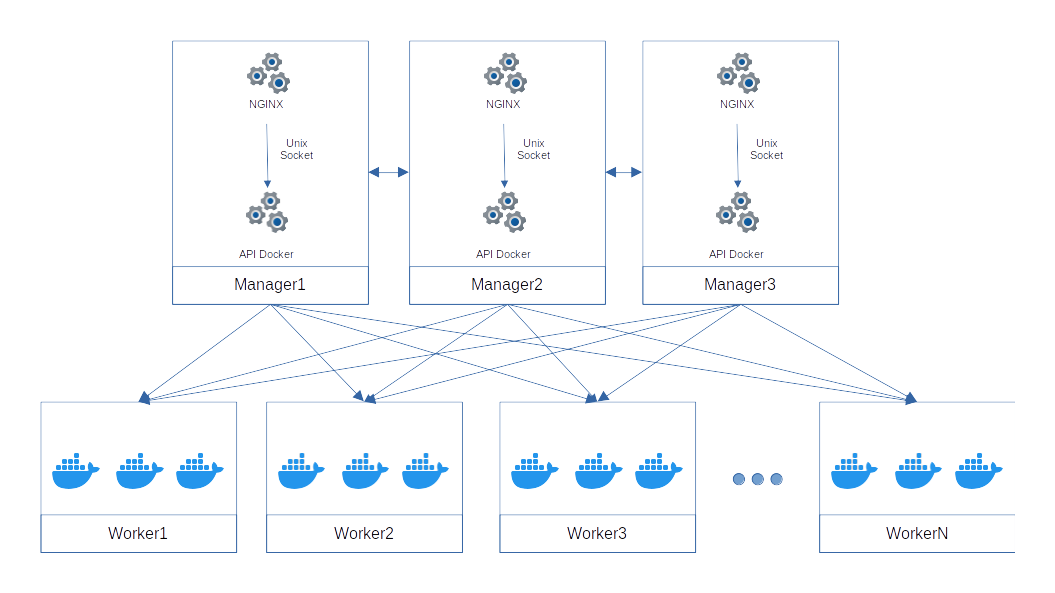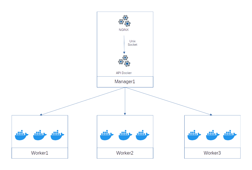 Container Creation via Unix Socket The Docker API, accessible only via Unix Socket, sends the request to the Docker engine (Swarm or another orchestrator) to launch the requested container.